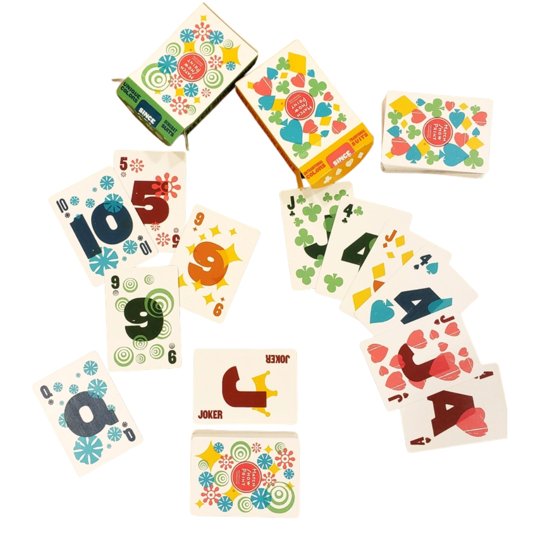 Every single visual element that makes up the colorful graphics of these decks of playing cards comes from the hand-carved printing blocks that have been created and used in the print shop from the early twentieth century to today. The typography and graphic elements are taken directly from the wood type and dingbats we use every day in the shop too.