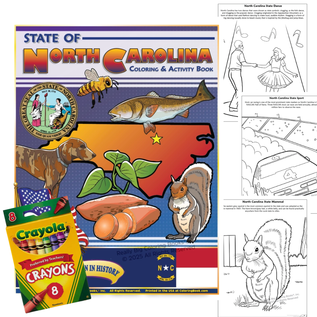 North Carolina State Coloring Book 8.5 x 11, this 32-page book is used as a teaching and learning tool. This North Carolina State Coloring, Activity and Game Book is designed to be a fun, educational activity book to help young children understand facts about the State of North Carolina. Through fun activities like matching, complete the state outline, flag matching and more, this interactive coloring book is both entertaining and educational. This approach to teaching captures both the imagination and creativity of students and helps them become excited to learn about all of the state of North Carolina.